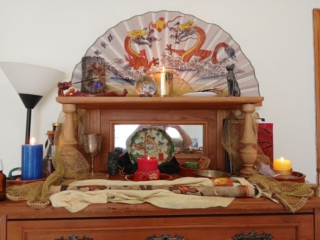 Mein Hausaltar strahlt in neuem Glanz. Ich arbeite am liebsten mit den vier Elementen der westlichen Magie. Luft im Osten, Feuer im Süden, Wasser im Westen und Erde im Norden.